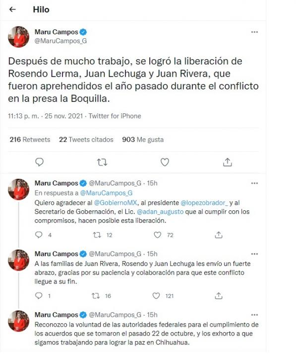 La gobernadora Maru Campos Galván informó que después de mucho trabajo y diversas gestiones, se logró la liberación de Rosendo Lerma, Juan Lechuga y Juan Rivera, tres productores que fueron aprehendidos y encarcelados el año pasado durante el conflicto en la presa La Boquilla.