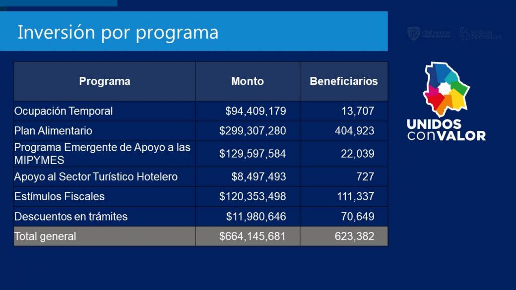 En cuanto a los recursos ejercidos a la fecha en los diversos programas del Plan Emergente, se han invertido 664 millones 145 mil 681 pesos, en beneficio de 623 mil 382 personas.