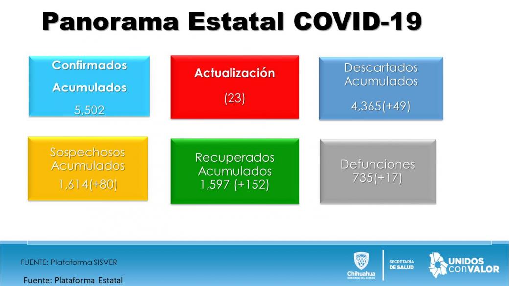 En la Conferencia Informativa #147 - Virtual #105 del Reporte COVID-19, el director médico de la Secretaría de Salud en la Zona Norte, Arturo Valenzuela Zorrilla informó que de los nuevos contagios, 40 son en la capital que llegó a 1,419; en Juárez 34 donde el total es de 3,088; mientras que Delicias subió 8 para ubicarse en 253.