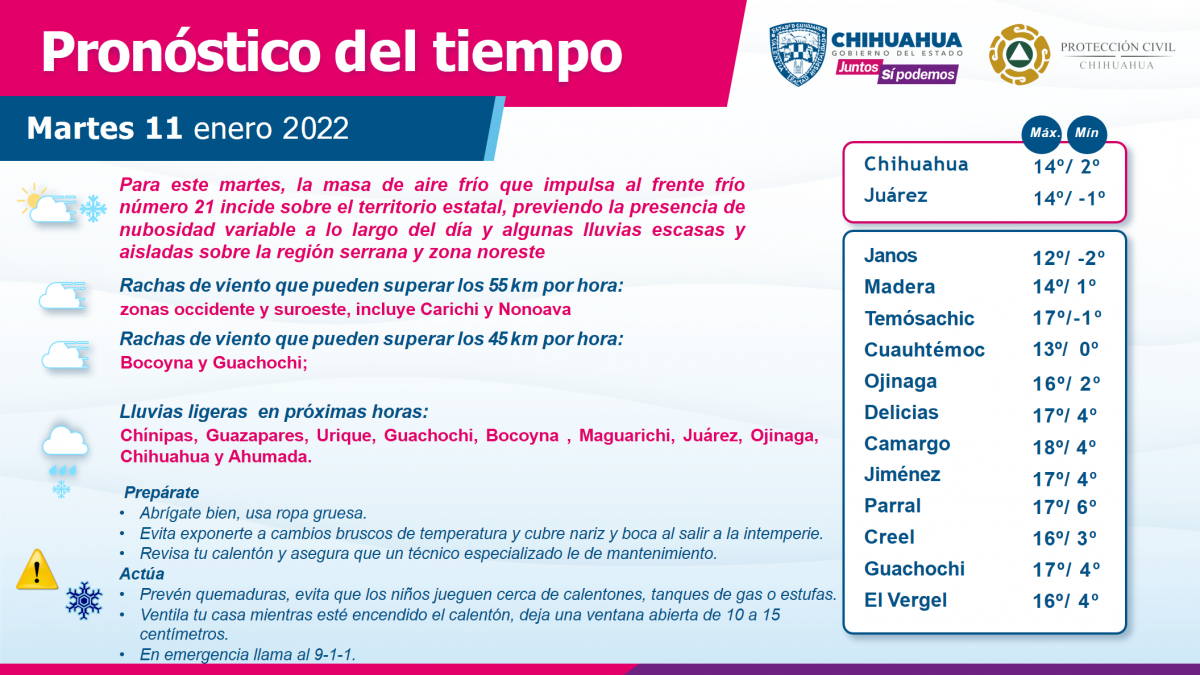 La masa de aire polar que impulsa al Frente Frío número 21 en interacción con la corriente en chorro, un canal de baja presión y un vórtice de núcleo frio en el sur de Estados Unidos favorecerá ambiente de muy frío a frío por la mañana, de fresco a templado por la tarde, con temperaturas de gélidas a muy frías con heladas en la zona serrana.