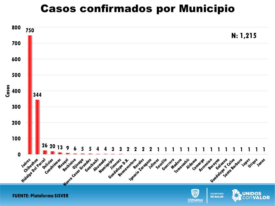 De los confirmados, 750 pertenecen a Juárez, 344 a la capital, 6 a Bachíniva, 13 a Cuauhtémoc, 5 a Ojinaga, 3 a Namiquipa, 9 a Meoqui, 1 a Julimes, 1 a Camargo, 1 a Saucillo, 4 de Ahumada, 2 a Guadalupe D.B., 4 a Guachochi, 20 a Delicias, 1 de Ascensión, 1 a Guerrero, 1 a Bocoyna, 1 a Madera, 26 a Parral, 2 a Buenaventura, 1 a Temósachi, 1 a Galeana, 1 a Guadalupe y Calvo, 5 a Nuevo Casas Grandes, 2 a Rosales, 3 a Jiménez, 1 de Aldama, 1 A Santa Bárbara, 2 a Ignacio Zaragoza, 1 a López, 1 a Urique y 1 a Janos.