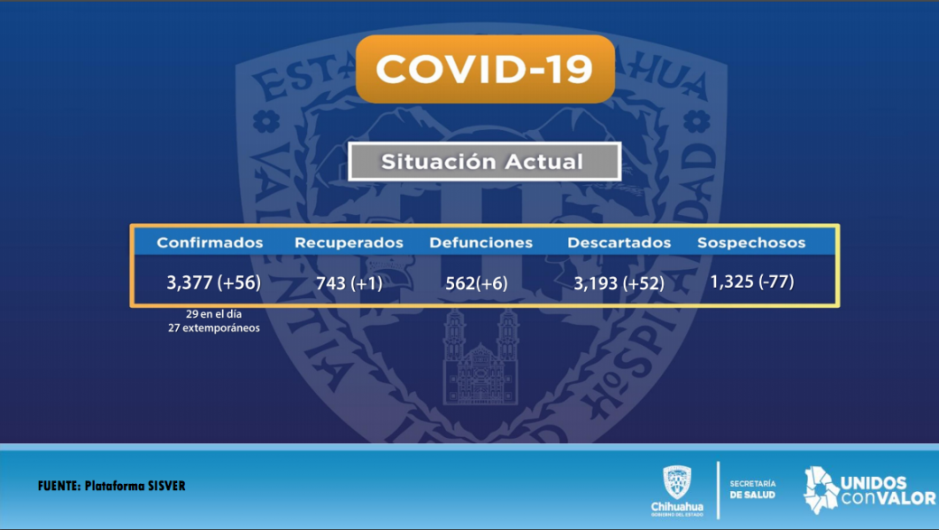 El subdirector médico de la Secretaría de Salud en la zona norte, Arturo Valenzuela, dio a conocer que el estado de Chihuahua llegó a 562 fallecimientos por COVID-19 y el número de contagios suma ya 3 mil 377.