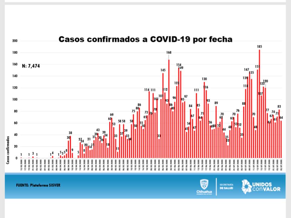 El número de casos confirmados de COVID-19 en el estado de Chihuahua, registró 77 nuevos contagios en el lapso de las últimas 24 horas, con lo que suman 7 mil 474, de acuerdo con información de la Secretaría de Salud.