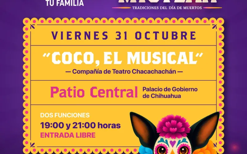 El viernes 31 de octubre se ofrecerá el espectáculo “Coco, el musical”, por parte de la compañía de teatro Chacachachán, con funciones a las 19:00 y a las 21:00 horas.