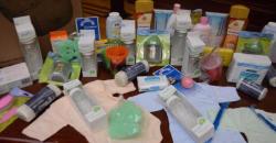 Los paquetes incluyen biberones de vidrio, pañales desechables, toallitas húmedas, jabones, champús...