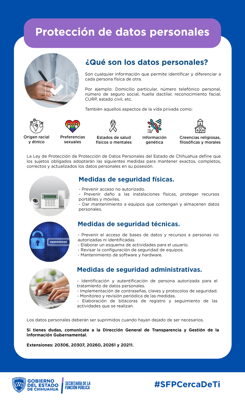 En la Secretaría de la Función Pública trabajamos todos los días para garantizar que la información que compartes —como tu domicilio, número telefónico, huellas dactilares, estado de salud o creencias— sea tratada con responsabilidad, bajo estrictas medidas de seguridad físicas, técnicas y administrativas.