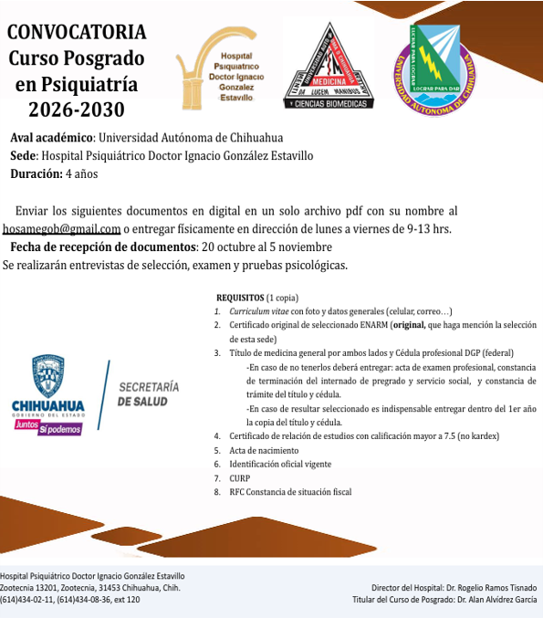 Enviado por rhernandez@ss el Lun, 27/10/2025 - 07:24 Dependencia Secretaría de Salud Img Vertical Liga o URL Curso posgrado psiquiatria 2026-2030