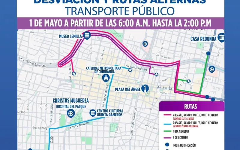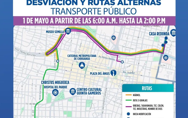 La Secretaría General de Gobierno, a través de la Subsecretaría de Transporte informó que con motivo del desfile por el Día de Trabajo, este viernes 1 de mayo habrá modificaciones en las rutas del transporte colectivo a su paso por el centro de la ciudad.