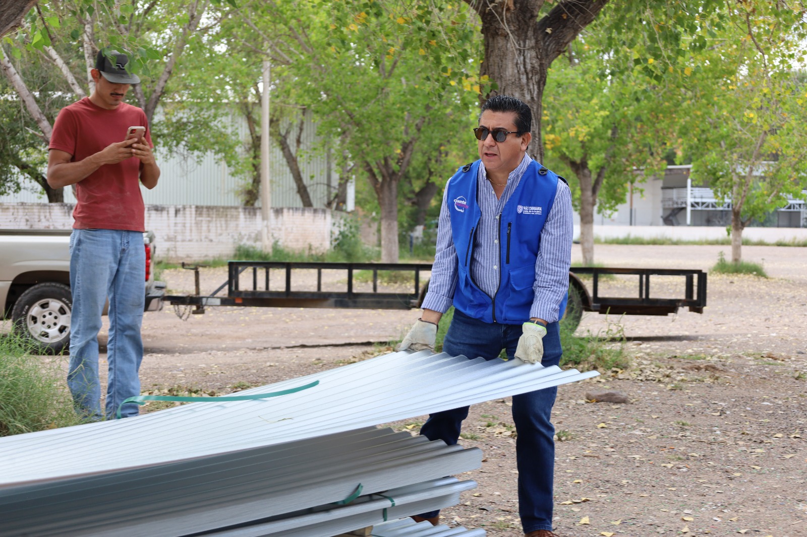 El director general de la dependencia, José Antonio Chávez Rodríguez, acompañado por el alcalde Fernando Ortega, encabezó el evento en que se distribuyó cemento, lámina, polín y varilla que serán utilizados para reforzar techos, muros y pisos de las viviendas.