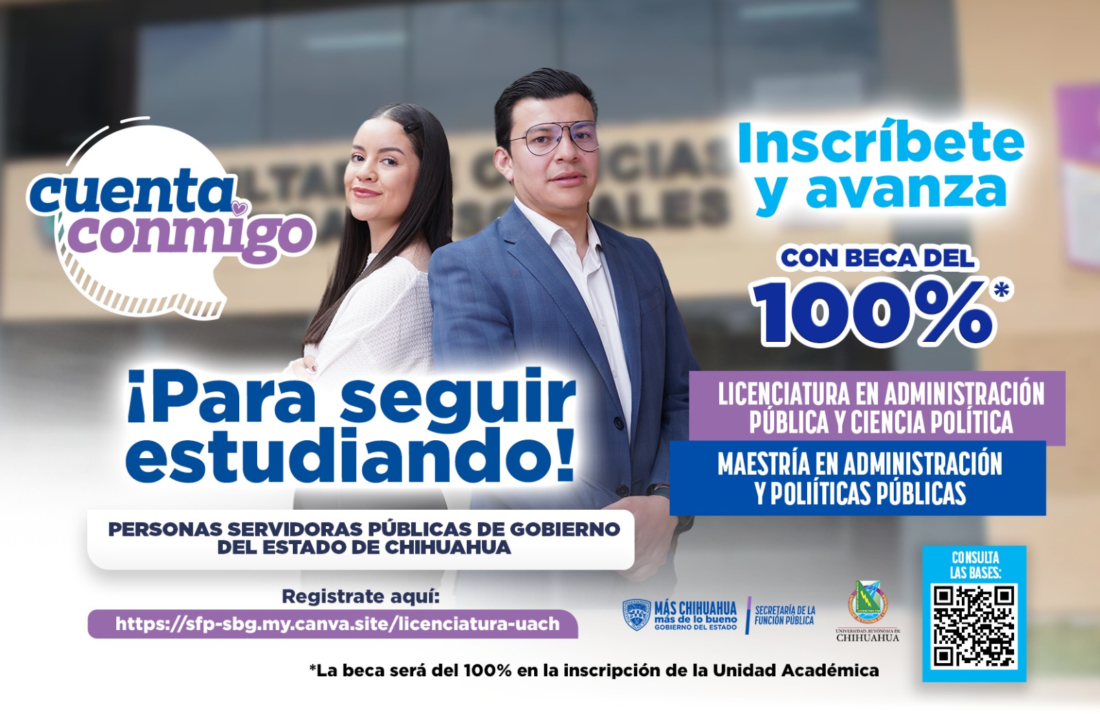La Secretaría de la Función Pública (SFP) invita a los servidores públicos del Gobierno del Estado, a participar en la convocatoria para cursar con beca completa alguno de los programas de educación Superior, que ofrece en colaboración con la Universidad Autónoma de Chihuahua (UACH).
