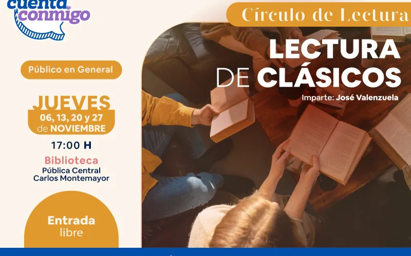 Los jueves 13, 20 y 27 de noviembre, en punto de las 17 horas, con entrada libre, se invita a participar en el círculo de Lectura de Clásicos, mediado por José Valenzuela, en el que se leen y discuten diversos títulos literarios, dirigido a público en general.