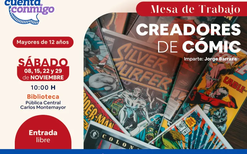 Los sábados 15, 22 y 29 de noviembre, a las 10 de la mañana, Jorge Barraza invita a niñas y niños mayores de 12 años a adentrarse en el mundo de los cómics, con el taller de creación de los mismos.