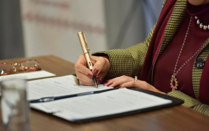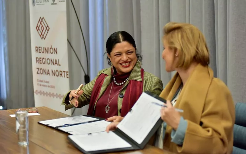 La gobernadora Maru Campos y la secretaria de Cultura estatal, Alejandra Enríquez, en compañía de la secretaria de Cultura Federal, Alejandra Frausto, firmaron el documento que compromete a ambas instancias a proyectar la presencia de Chihuahua en el país y en el extranjero, a través del impulso a la cultura.