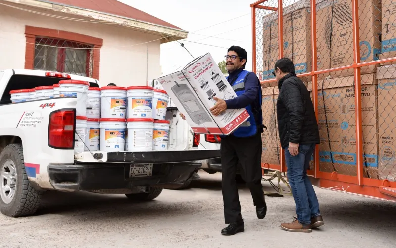 La entrega incluye materiales que mejoran la calidad de estancia de estudiantes y docentes, como aires evaporativos, calentones, mesas de trabajo, butacas, pizarrones, impermeabilizante y pintura.