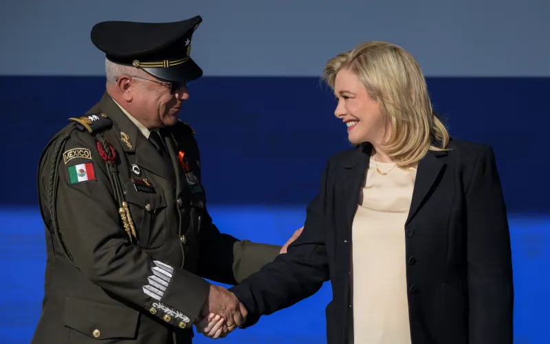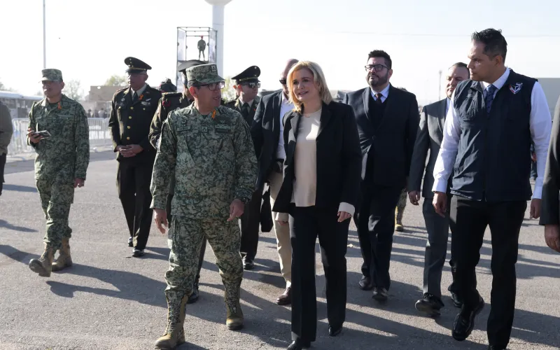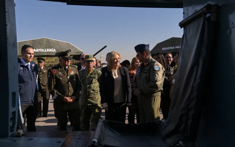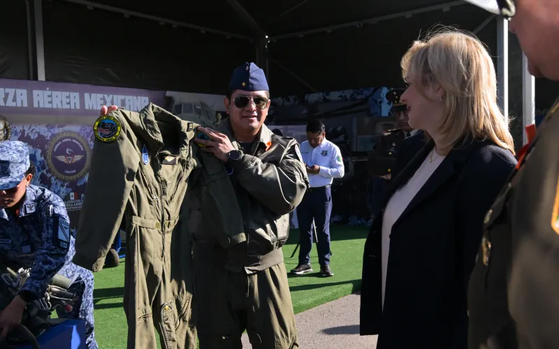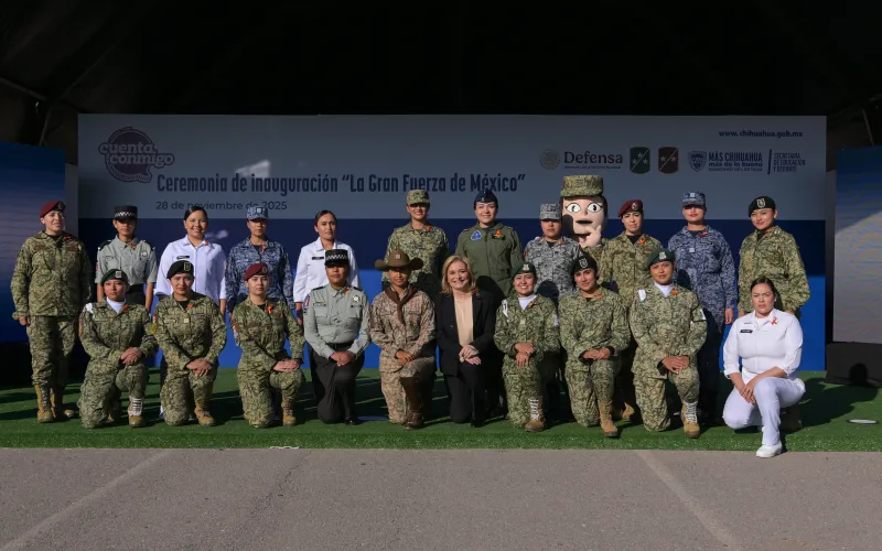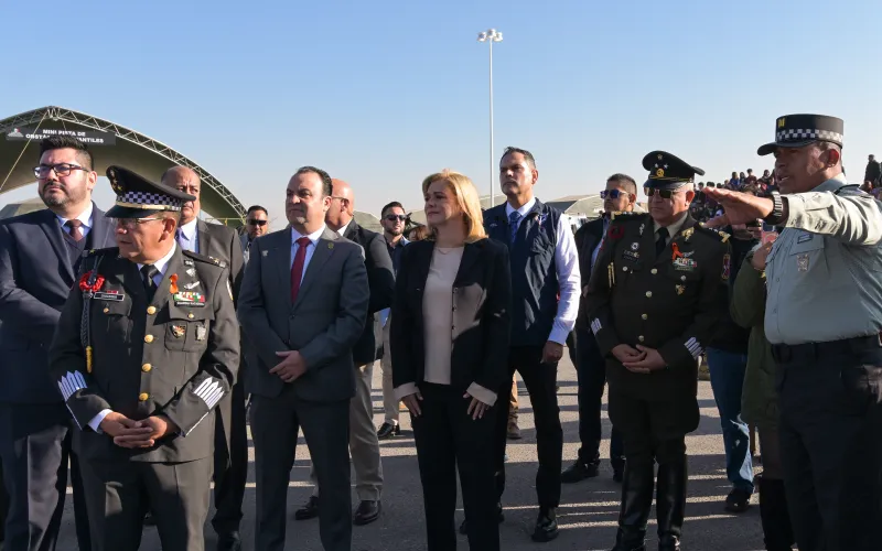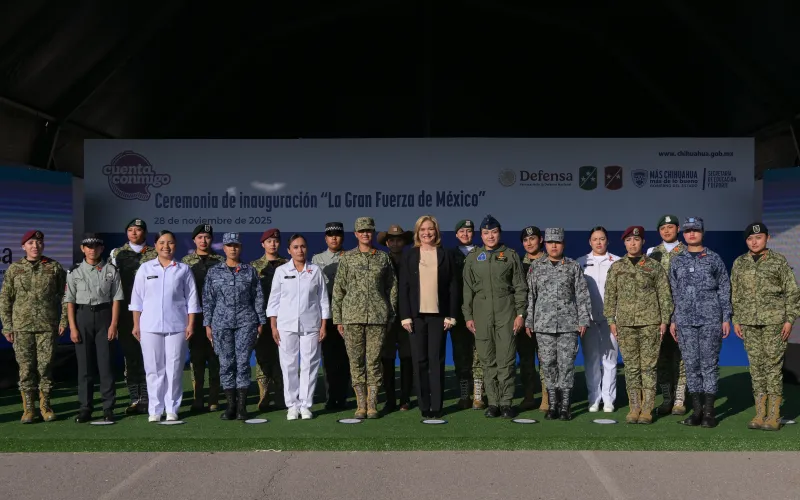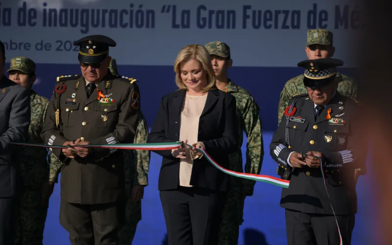 La gobernadora Maru Campos acudió como invitada de honor a la ceremonia de inauguración de la exposición militar “La Gran Fuerza de México”, en la que la Secretaría de la Defensa Nacional (Sedena) muestra a la ciudadanía parte de su equipo y esquema de trabajo.