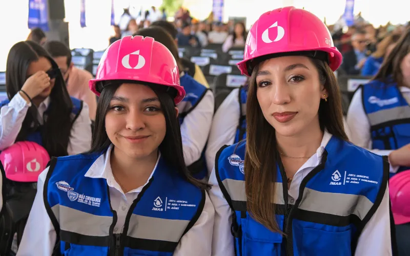 Como parte del evento, 50 colaboradoras de la Junta Municipal de Agua y Saneamiento (JMAS) rindieron protesta como nuevas integrantes del programa “Cascos Rosas”, iniciativa que impulsa la participación, capacitación y liderazgo de las mujeres en el sector hídrico.