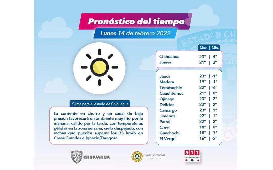 Lunes 14 Febrero 2022 La Coordinación Estatal de Protección Civil informa el clima para éste Lunes 14 de Febrero de 2022.