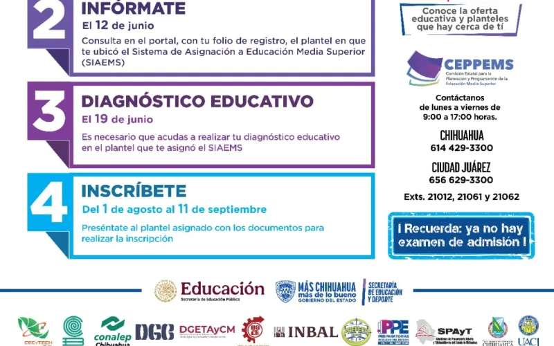Por ello, la Comisión Estatal para la Planeación y Programación de la Educación Media Superior (Ceppems), integrada por todos los Subsistemas de EMS de Chihuahua, acordó que no se realizará examen de ingreso, de tal forma que no habrá fichas para el examen.