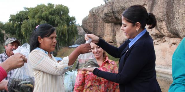 Las Juntas, Carichí, Chih.- Como parte de la estrategia para el desarrollo sostenible en las comunidades más apartadas y sobre todo en las indígenas, que tiene en su proyecto de trabajo el DIF Estatal, el organismo descentralizado entregó en esta comunidad, el pasado martes, cinco mil crías de trucha arcoíris, cincuenta sacos de alimento de inicio, 75 de crecimiento y 125 de alimento de engorda, necesarios para asegurar el mantenimiento de este proyecto productivo.