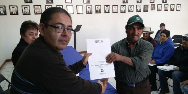 La Secretaría de Desarrollo Rural, a través de personal del Departamento Jurídico, entregó 23 títulos de propiedad a 16 hombres y 7 mujeres del Mancomún Bichíhuare, municipio de Temósachi y de la Colonia Agrícola, Ganadera y Forestal en Nahuerachi, del municipio de Madera, con una superficie total regularizada de 169-18-23 hectáreas.