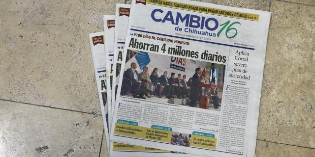 El Gobierno del Estado publicó hoy, en tres diarios que se editan en el estado, dos licitaciones públicas para la "impresión" y "distribución" del periódico Cambio 16 de Chihuahua y que van acorde a la postura que fijó el gobernador Javier Corral: