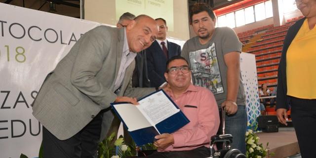 Durante la ceremonia, las autoridades educativas y sindicales, realizaron la entrega oficial de asignación de plazas a las y los sustentantes, que obtuvieron los primeros lugares en el Concurso de Oposición para el Ingreso a la Educación Básica.