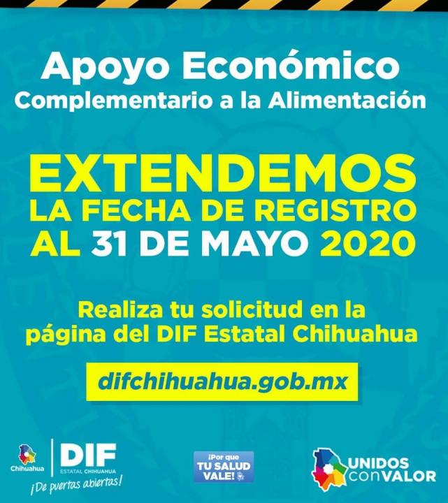 Con la finalidad de atender a las familias en situación de vulnerabilidad por las medidas sanitarias para la contención del COVID-19, el Desarrollo Integral de la Familia (DIF) Estatal Chihuahua amplió el plazo hasta este domingo 31 de mayo para las inscripciones al programa de Apoyo Económico Complementario a la Alimentación en Ciudad Juárez, Delicias, Parral y Cuauhtémoc.