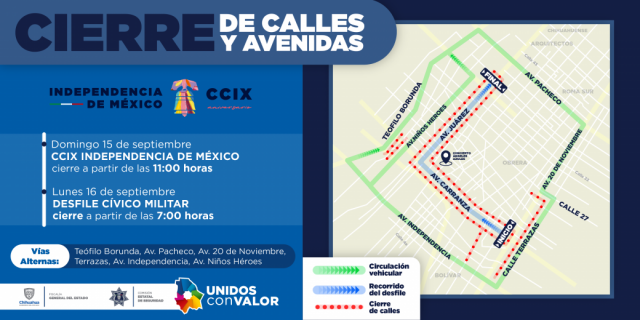 Como vías alternas para ambos eventos, se podrán usar las avenidas Teófilo Borunda y Pacheco, así como las calles José Joaquín Terrazas e Independencia, siempre y cuando no se dirijan hacia la ruta del desfile.