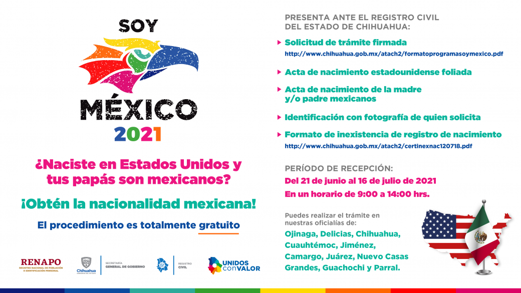El Registro Civil del Estado de Chihuahua recuerda a la ciudadanía que el trámite para obtener la nacionalidad mexicana a través del programa Soy México es totalmente gratuito.