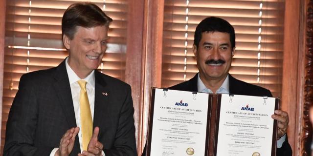 La Fiscalía General del Estado de Chihuahua cuenta a partir de este día con la acreditación de nueve especialidades y dos laboratorios forenses de servicios periciales, el de Juárez y el de Chihuahua, por parte de la Agencia Internacional National Accreditation Board (ANAB por sus siglas en inglés).
