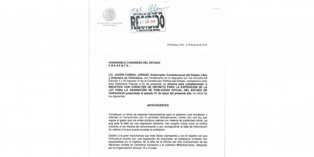 Ante las sugerencias y recomendaciones de organismos internacionales especializados y ante el firme compromiso del Gobierno Estatal con la salvaguarda e impulso a los derechos humanos, el gobernador Javier Corral Jurado envió al Congreso del Estado un complemento a la Iniciativa de Ley para la Asignación de Publicidad Oficial del Estado de Chihuahua, presentada el pasado 31 de mayo.