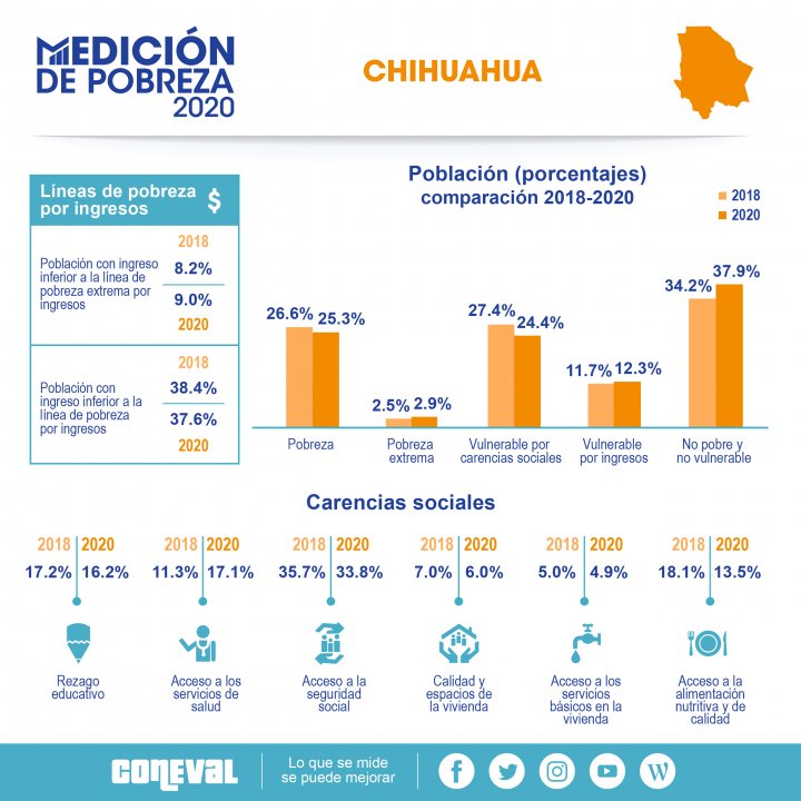 En Chihuahua la disminución porcentual fue de 7% a 6% y en números absolutos, de 256 mil 900 personas a 226 mil 400. Aquí favorece al estado el ritmo de avance, pues en 2018 era el 7º mejor estado en este rubro y ahora ocupa el 9º.