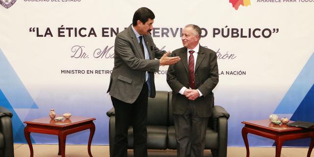 “Un personaje singular en la vida del Poder Judicial, una de las figuras que en el servicio público de la impartición de justicia, puede encarnar en los hechos, la palabra y la acción que se compromete con la ética. Le hemos invitado para que desde su experiencia, su biografía personal, su compromiso con la justicia y su tránsito por la Suprema Corte, nos pueda compartir su visión ética sobre uno de los instrumentos que el Gobierno de Chihuahua ha emitido que es su propio Código”, expresó el gobernador, Javier Corral, al presentarlo ante funcionarios y burócratas en el Patio Central de Palacio de Gobierno.