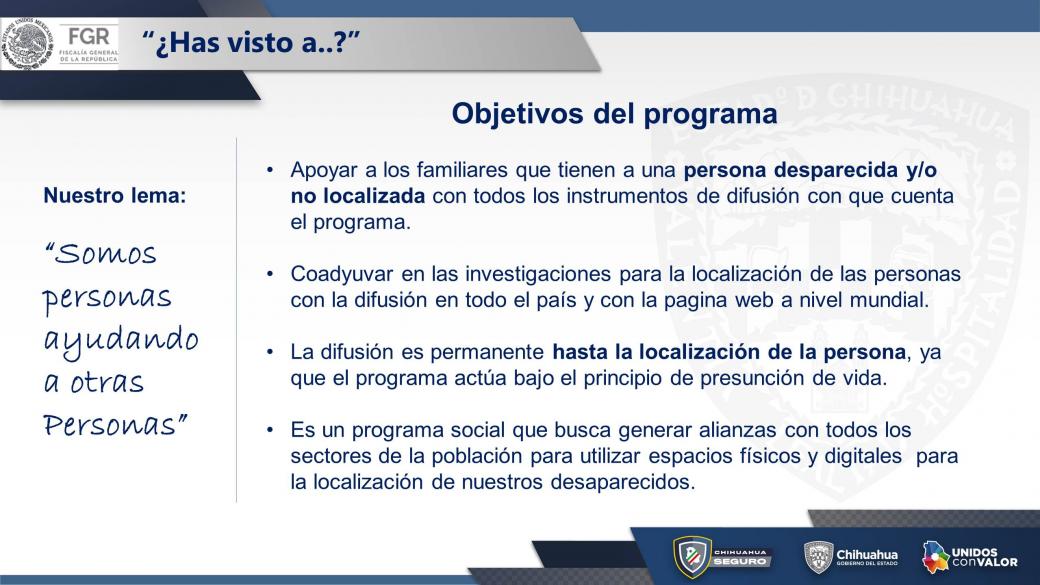 Programa nacional se basa en el principio de la presunción de vida; con el apoyo de medios de comunicación, empresariado y población en general, se amplía la posibilidad de obtener información que lleve a la localización