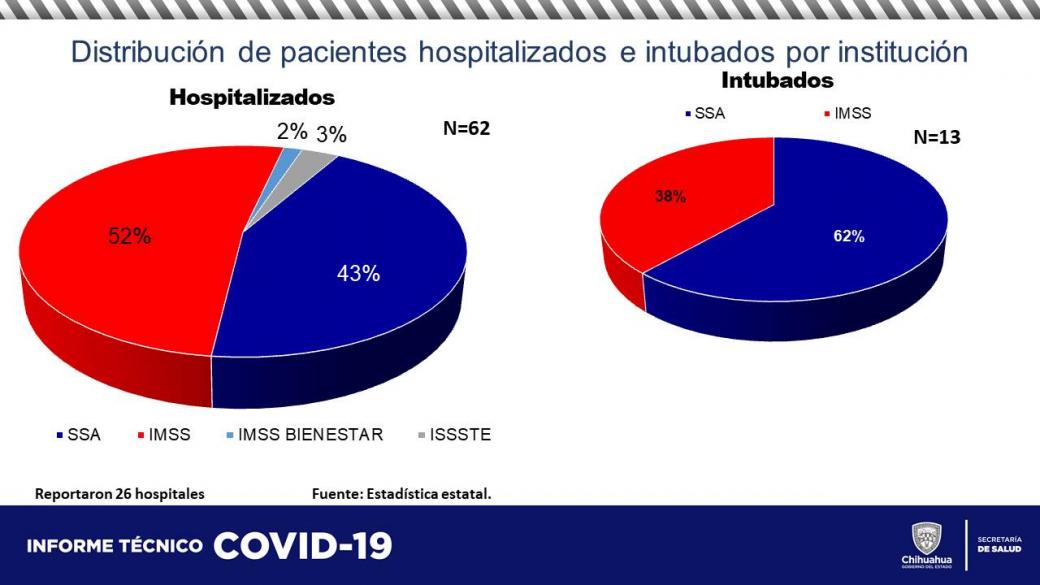 El registro es de 62 pacientes hospitalizados: 52% derechohabientes del IMSS, 43% del Sector Salud, 3% del Issste y 2% del IMSS Bienestar; del total 13 se encuentran intubados, de acuerdo al reporte de 26 unidades médicas.