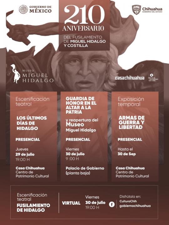 Para el día 29 a las 19:00 horas se presentará la escenificación teatral “Los últimos días de Hidalgo”, en el Centro de Patrimonio Cultural Casa Chihuahua, mientras que el viernes 30 se montará una guardia de honor en el Altar a la Patria, ubicado en la planta baja de Palacio de Gobierno, a las 9:00 horas.