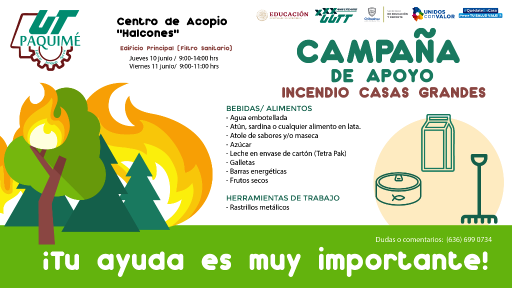 Ante esta grave situación, la UT Paquimé instaló el Centro de Acopio “Halcones” en su edificio principal, y lanzó la convocatoria a la población de todo el Estado de Chihuahua, para que realice sus donaciones en especie y brindar así, apoyo a las y los combatientes del incendio, que arriesgan su vida de manera voluntaria, para controlar el siniestro.