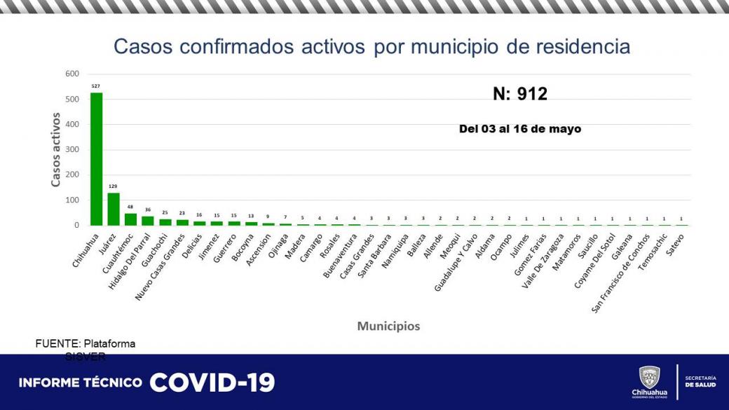 Con respecto a la tabla de Casos Confirmados Activos por Municipio de Residencia, reportados del 03 al 16 de mayo, Chihuahua sigue a la cabeza con 527 contagios, mientras que Juárez le secunda con 129, Cuauhtémoc con 48 y Parral con 36.