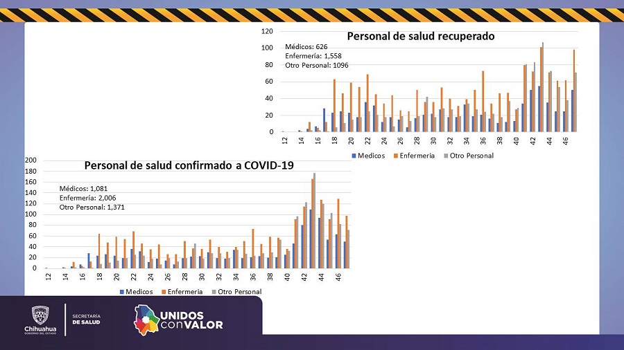 En cuanto al personal de enfermería, los casos confirmados son 2 mil 006, de los cuales mil 510 son mujeres y 496 hombres. Las defunciones han sido 12 (6 mujeres y 6 hombres), y mil 558 recuperados, de los cuales mil 156 son mujeres y 402 hombres.