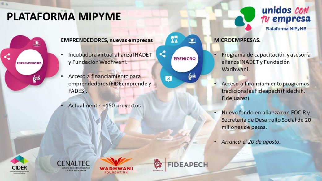 La Plataforma MiPyME Chihuahua fue posible por la alianza estratégica con 45 instituciones públicas, privadas y educativas, como la internacional Fundación Wadhwani y el FOCIR de la Secretaría de Hacienda y Crédito Público del Gobierno Federal.
