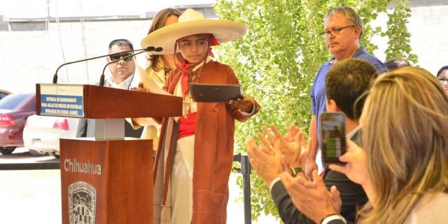 Jesús Alfredo Favela Alarcón, estudiante del plantel “Escritores de Chihuahua” agradeció la dotación del aula de medios y se comprometió a nombre de sus compañeros a darle buen uso al equipo y aprovecharla al máximo. Aprovechó para solicitarle al gobernador un domo para practicar danza folclórica y continuar compitiendo para obtener más campeonatos y una barda para su escuela.