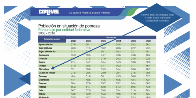 El comportamiento del índice de pobreza en la entidad chihuahuense fue de un 32.1% registrado en 2008; 38.8% en 2010; 35.3% en 2012; 34.4% en 2014; 30.6% en 2016, y 26.3% en 2018.