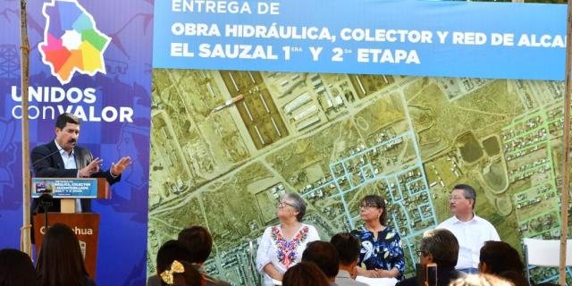 El gobernador Javier Corral Jurado encabezó la entrega de obra hidráulica, colector y red de alcantarillado, para dotar de drenaje sanitario a 517 familias del poblado de El Sauzal, en el Valle de Juárez, con una inversión de 16 millones de pesos, por parte de la Junta Municipal de Agua y Saneamiento de Juárez (JMAS) y del programa federal Proagua.