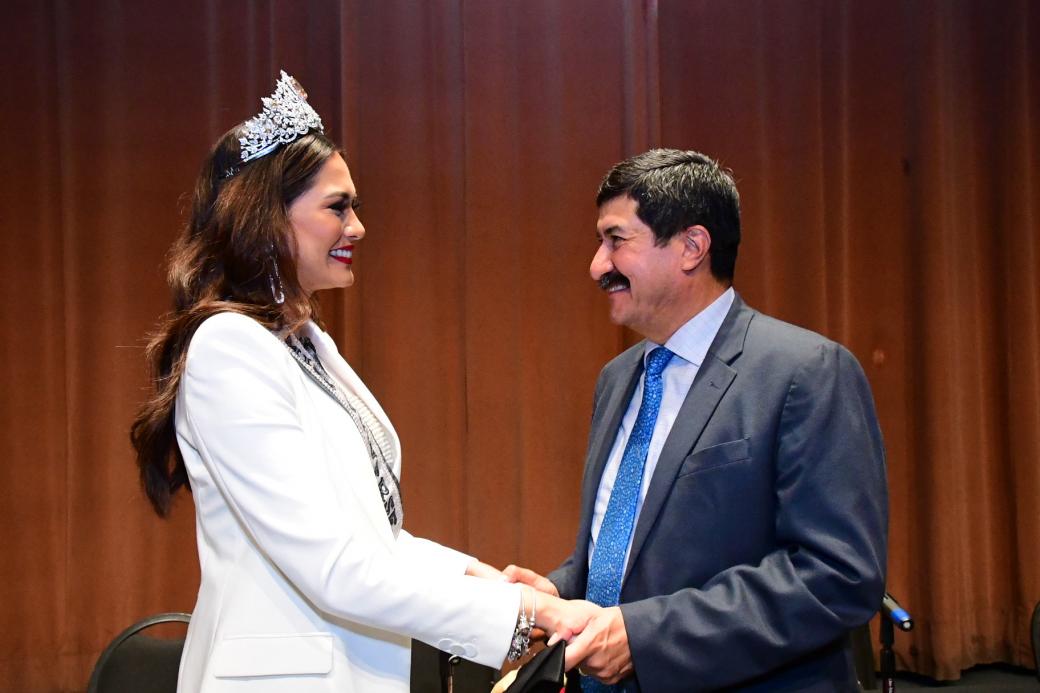 Javier Corral también dio la bienvenida a Lupita Jones, la primera mexicana Miss Universo en 1991, quien desde hace varias décadas es orgullo de México como pionera de esta participación de belleza y talento femenino.