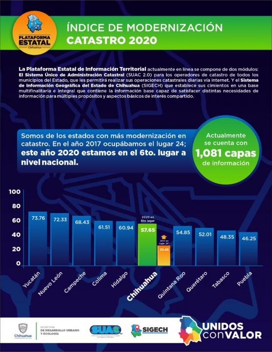 El estado de Chihuahua se posicionó como uno de los estados con más modernización en catastro, al colocarse en sexto lugar a nivel nacional informó el gobernador Javier Corral Jurado al dar a conocer la medición de la Plataforma Estatal de Información Territorial.
