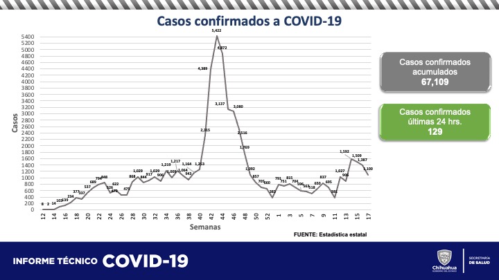 En cuanto a contagios registrados por COVID-19, la dependencia dio a conocer que se reportaron 129 nuevo casos, con los cuales el estado suma un total general de 67 mil 109 infecciones.