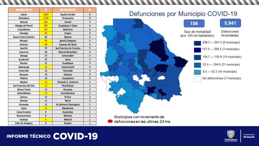 El último reporte epidemiológico muestra que el total de personas fallecidas es de 5 mil 941 casos, con 51 nuevos defunciones: 10 en Juárez, 22 en Chihuahua, 3 en Delicias, 3 en Meoqui, 2 en Parral, 2 en Cuauhtémoc, 2 en Jiménez, y uno en cada uno de Santa Bárbara, Camargo, Namiquipa, San Francisco del Oro, Madera, López y Ocampo.