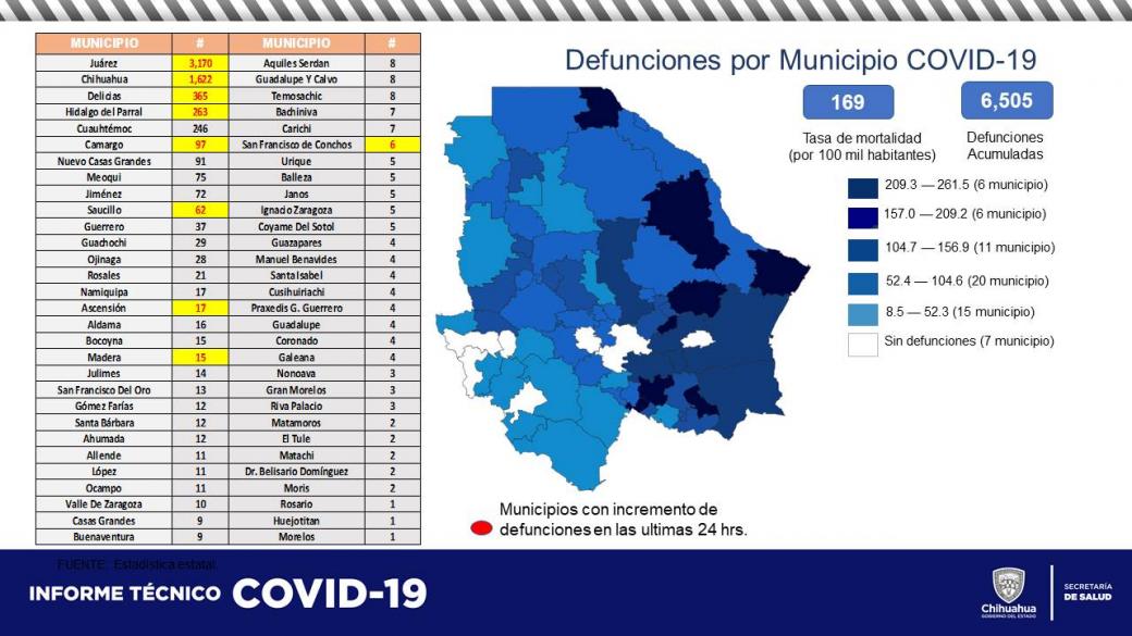 Acumulado de decesos por municipio: 3,170 Juárez, 1,622 Chihuahua, 365 Delicias, 263 Parral, 246 Cuauhtémoc, 97 Camargo, 91 Nuevo Casas Grandes, 75 Meoqui, 72 Jiménez, 62 Saucillo, 37 Guerrero, 29 Guachochi, 28 Ojinaga, 21 Rosales, 17 Namiquipa, 17 Ascensión, 15 Aldama, 15 Bocoyna, 15 Madera, 14 Julimes, 13 San Francisco del Oro, 12 Gómez Farías, 12 Santa Bárbara, 12 Ahumada, 11 Allende, 11 López, 11 Ocampo, 10 Valle de Zaragoza, 9 Buenaventura, 9 Casas Grandes, 8 Aquiles Serdán, 8 Temósachic, 8 Guadalupe y Calvo, 7 Carichí, 7 Bachíniva, 5 Urique, 5 Coyame, 6 San Francisco de Conchos, 5 Balleza, 5 Ignacio Zaragoza, 5 Janos, 4 Galeana, 4 Guadalupe D.B., 4 Santa Isabel, 4 Cusihuiriachi, 4 Coronado, 4 Manuel Benavides, 4 Praxedis G. Guerrero, 4 Guazapares, 3 Riva Palacio, 3 Gran Morelos, 3 Nonoava, 2 Dr. Belisario Domínguez, 2 Moris, 2 El Tule, 2 Matachí, 2 Matamoros, 1 Huejotitán, 1 Morelos y 1 Rosario.