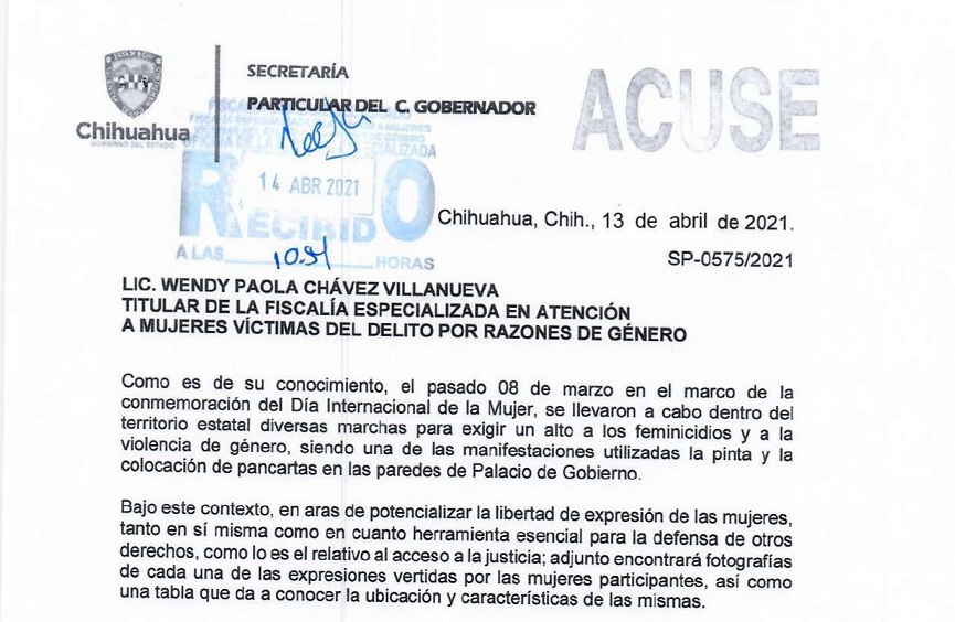 En aras de potencializar la libertad de expresión de las mujeres, manda Javier Corral oficio a la titular de la Fiscalía Especializada en Atención a Mujeres Víctimas del Delito en Razones de Género y adjunta fotografías de cada una de las expresiones vertidas en las paredes de Palacio de Gobierno