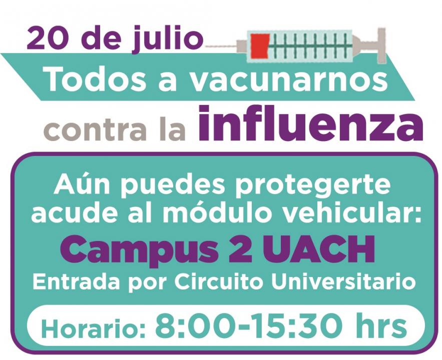 La Secretaría de Salud estatal aplicará la vacuna contra la influenza a personas de todas las edades y completará esquemas de vacunación en niñas y niños, este martes 20 de julio en el módulo vehicular del Campus II de la UACH, en un horario de 8:00 de la mañana hasta las 3:00 de la tarde.